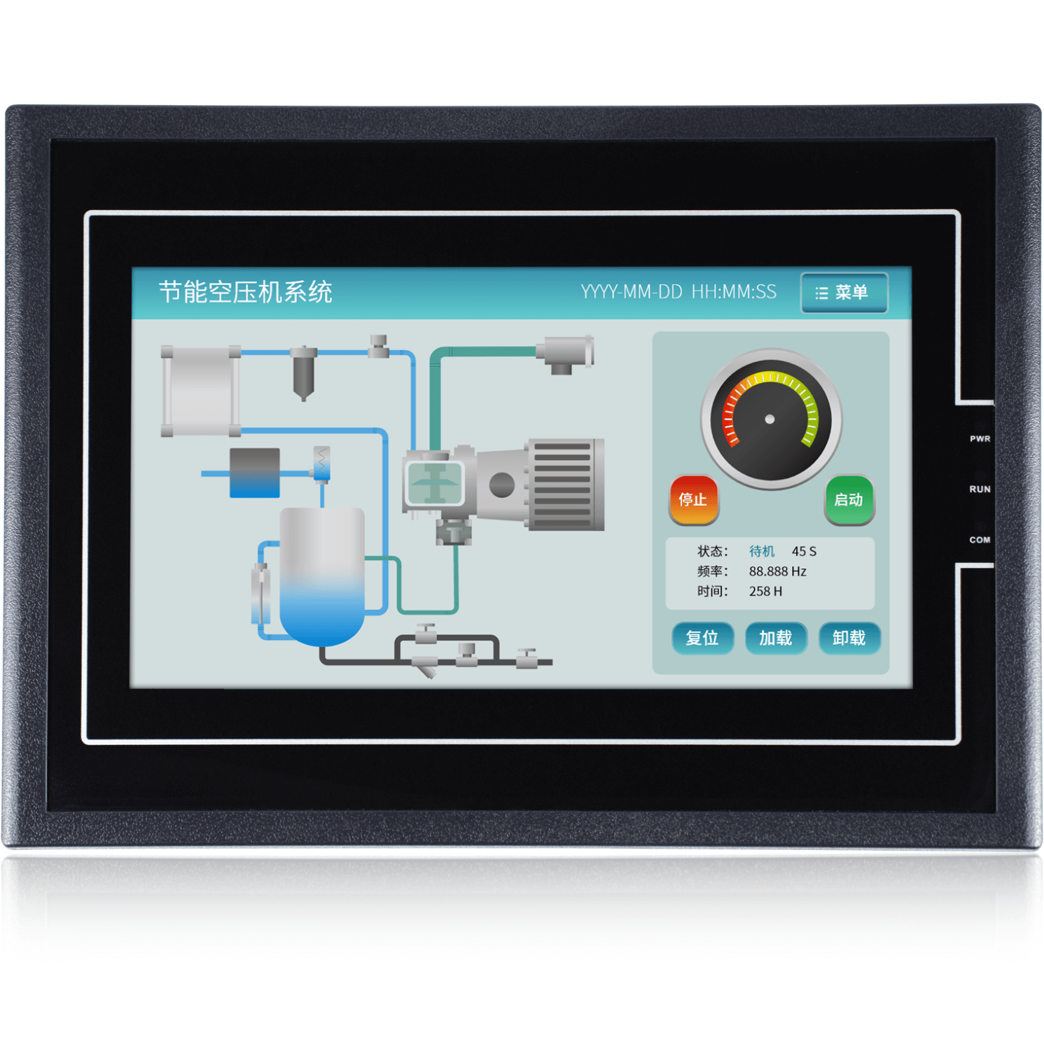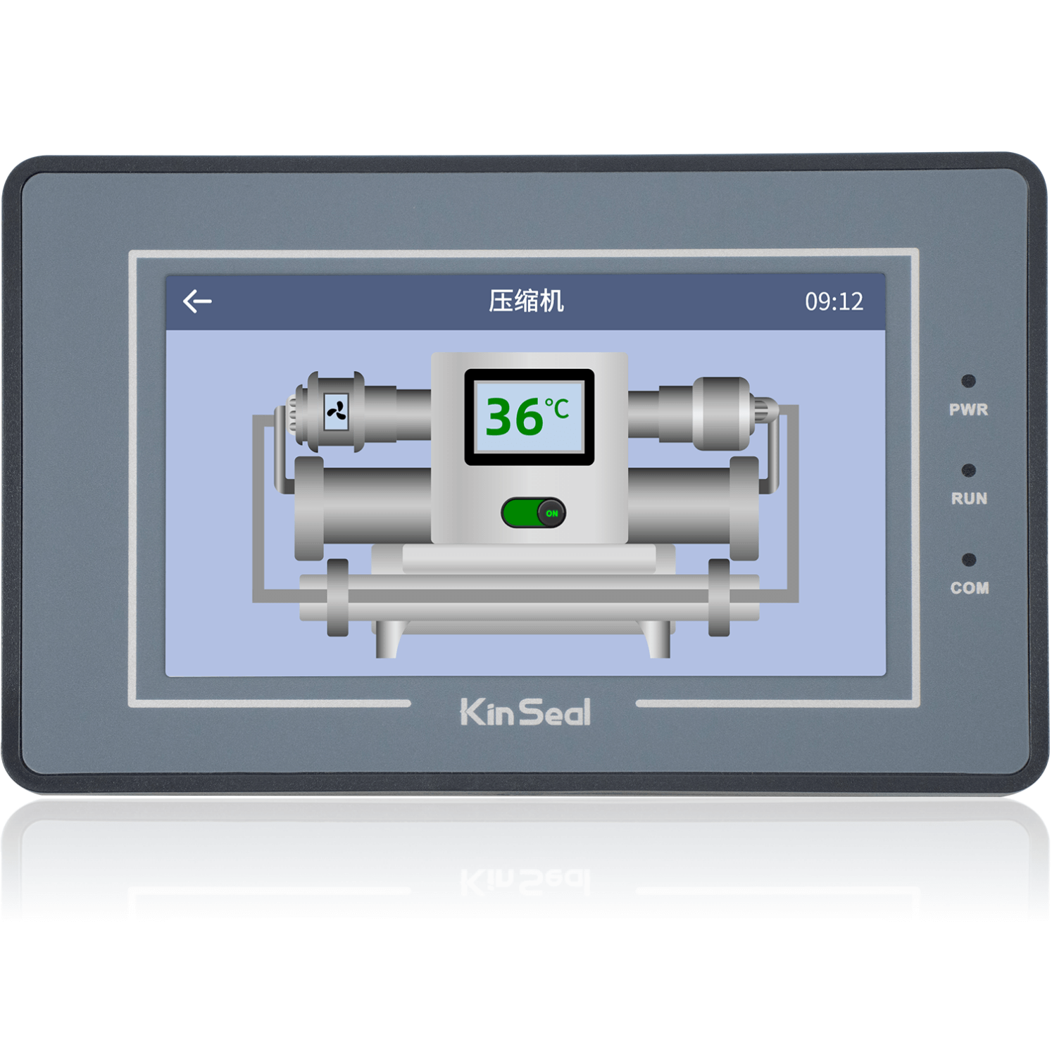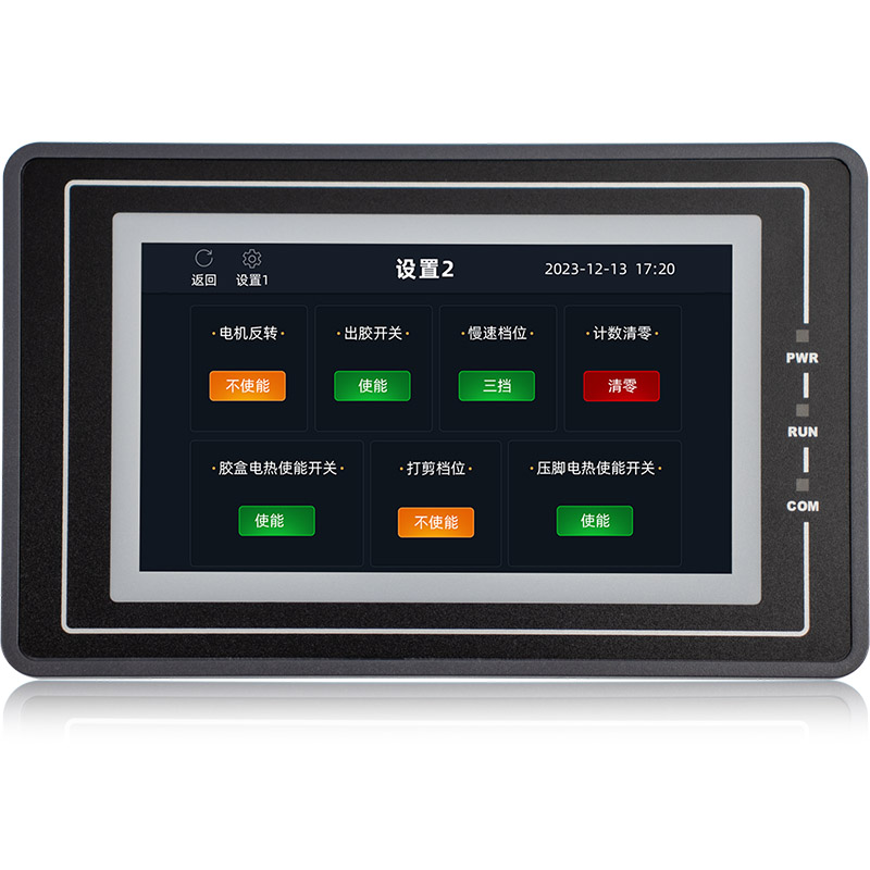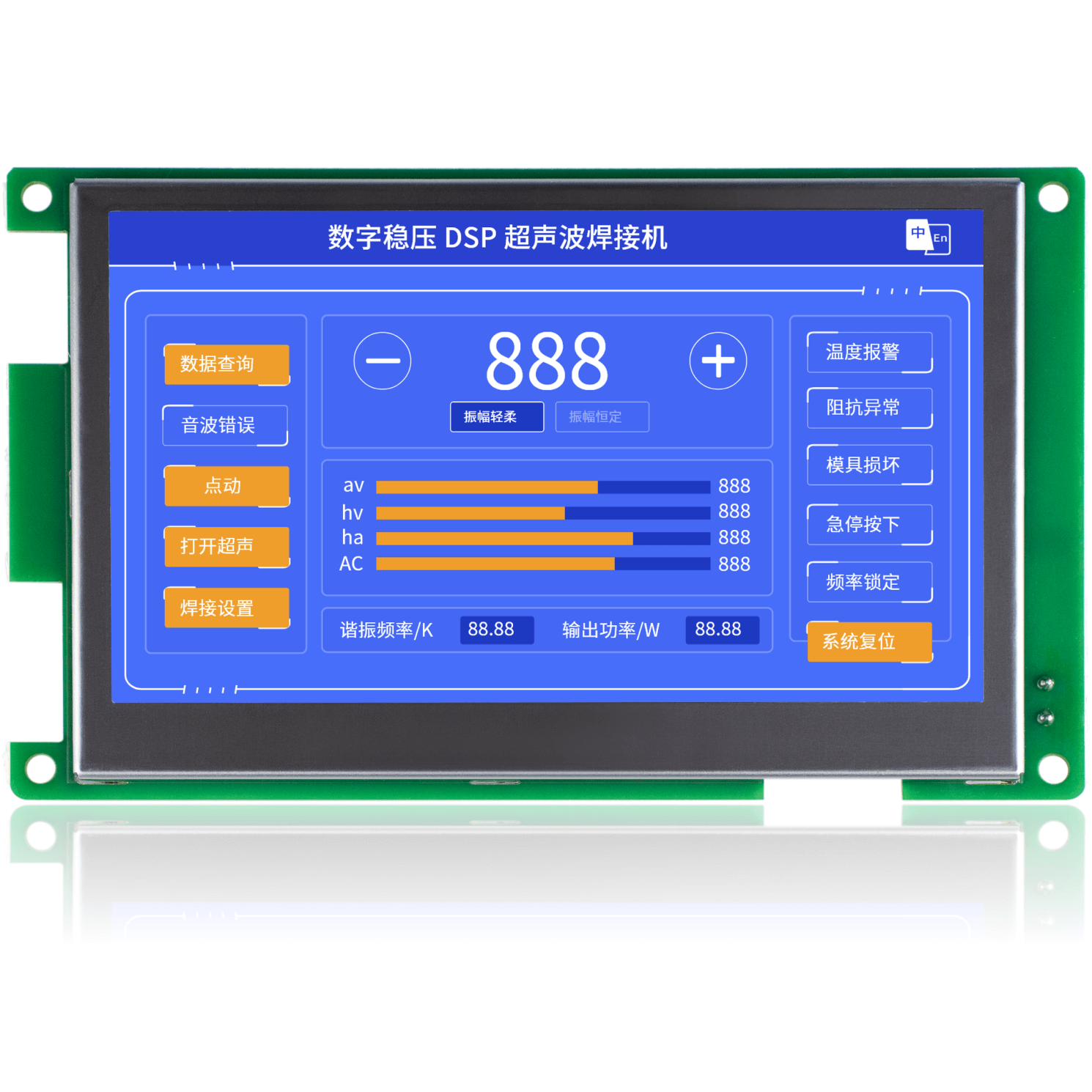金璽HMI應用在超聲波控制上,安裝在控制機箱上對超聲波進行數(shù)據(jù)設定和監(jiān)控。